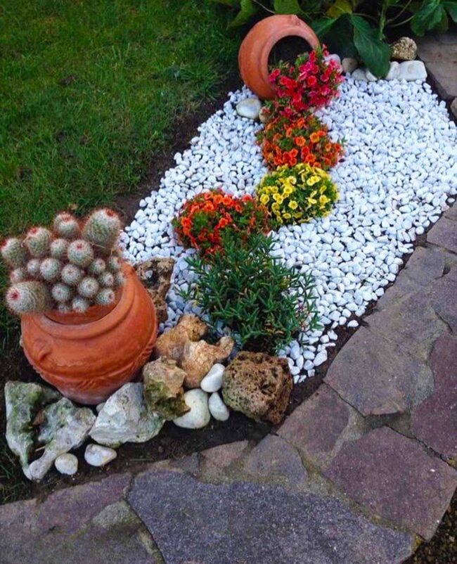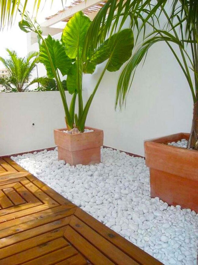 Smooth white pebbles scattered beneath the pots add visual interest and peaceful ground cover.