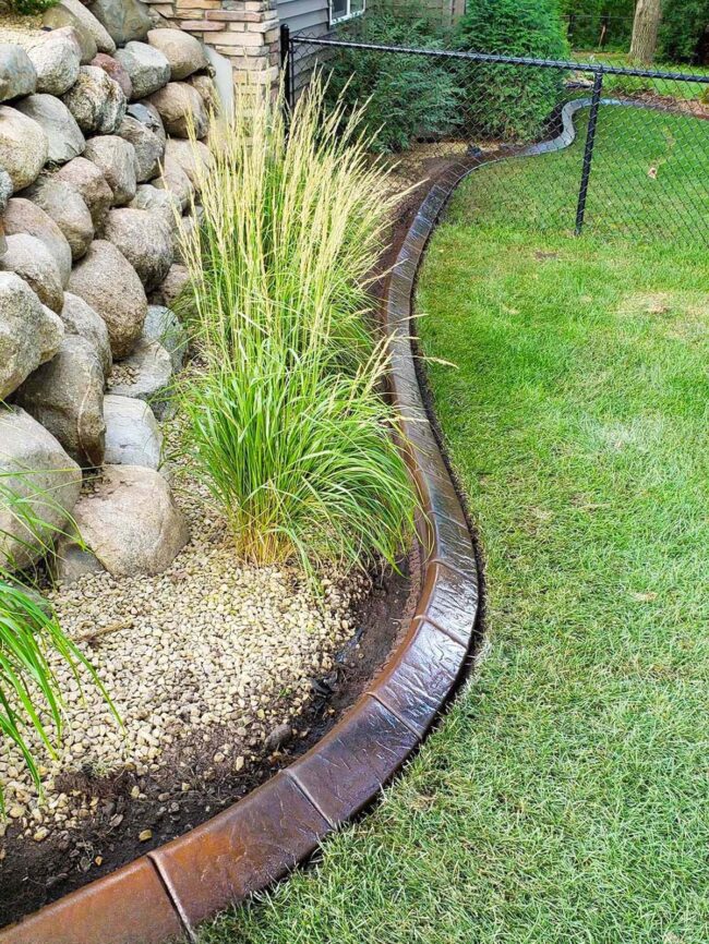 Ornamental grasses rise dramatically from carefully placed metal borders, creating visual drama and movement throughout the space.