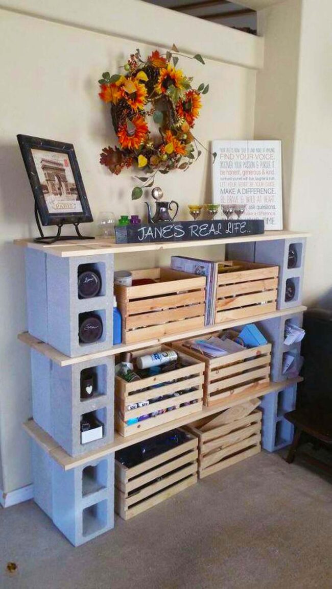 Weathered wood and sturdy concrete blocks combine to form a custom storage system that withsteps traditional shelving limitations.