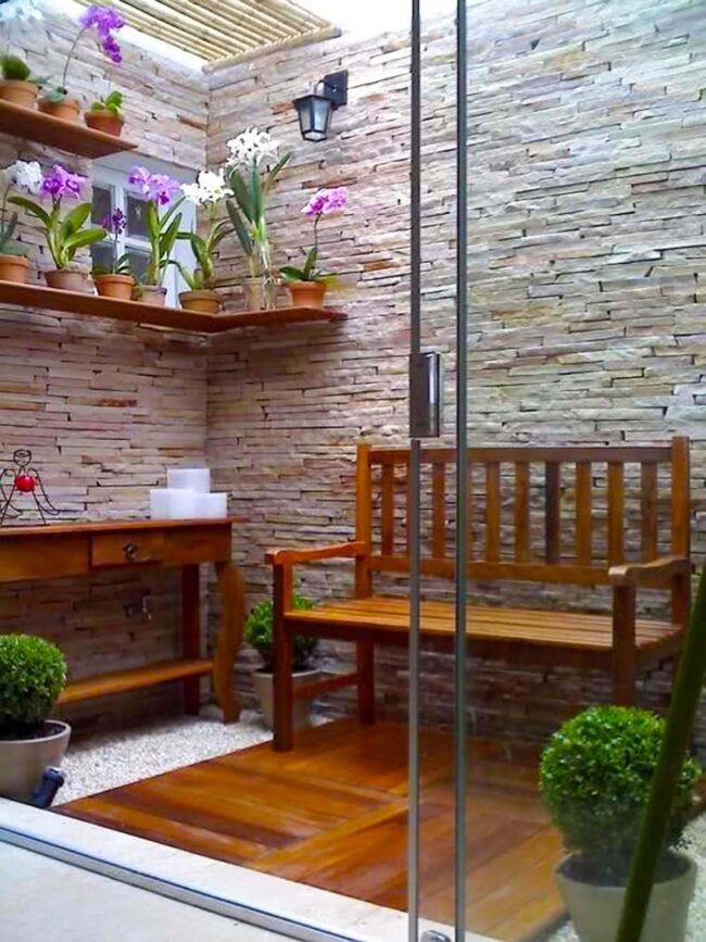 Strategic placement of greenery maximizes the limited outdoor space, proving small areas can become dramatic botanical retreats.