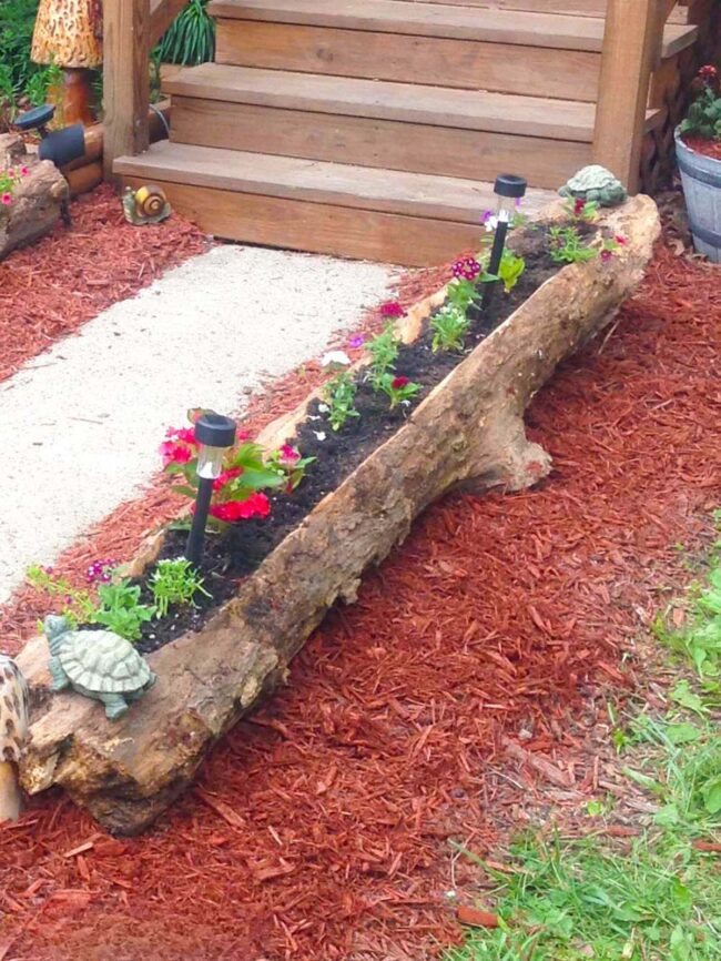 Red mulch surrounding the log enhances the natural aesthetic, adding depth and warmth to the planting area.