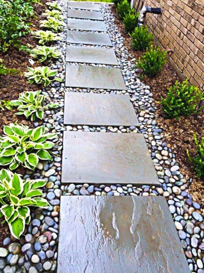 Expert landscapers carefully select rectangular stones and polished river rocks to craft stunning walkways that balance beauty and functionality.