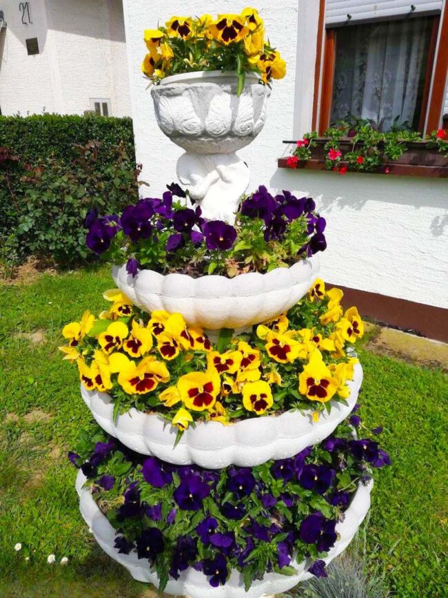 Cascading pansies in rich purples and sunny yellows create a breathtaking waterfall effect within a classic white planter, transforming an ordinary garden space into an extraordinary visual experience.