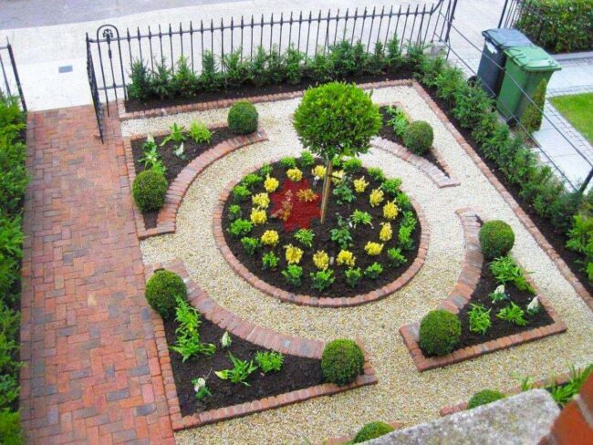 Bold circular flower beds create visual interest when connected by brick pathways that guide the eye through meticulously crafted landscapes.