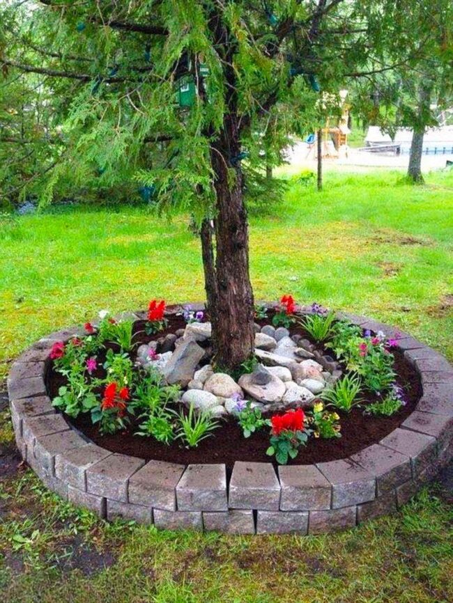 Stone borders help prevent soil erosion and minimize lawn maintenance around mature trees.