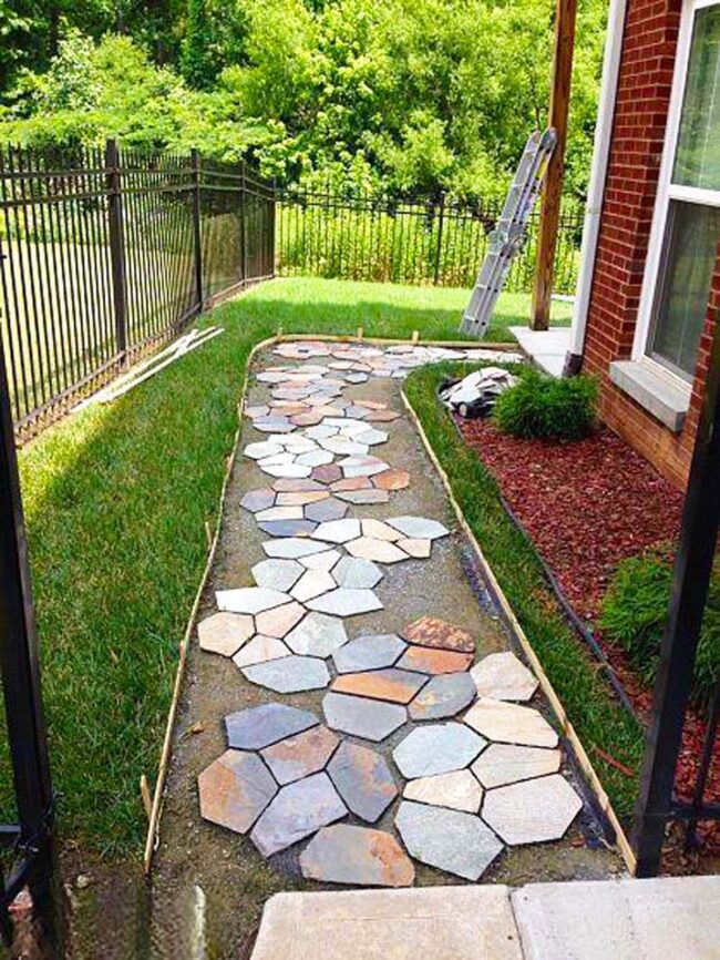 Weathered slate surfaces enhance the natural charm of landscape design, inviting peaceful wanderings through verdant spaces.