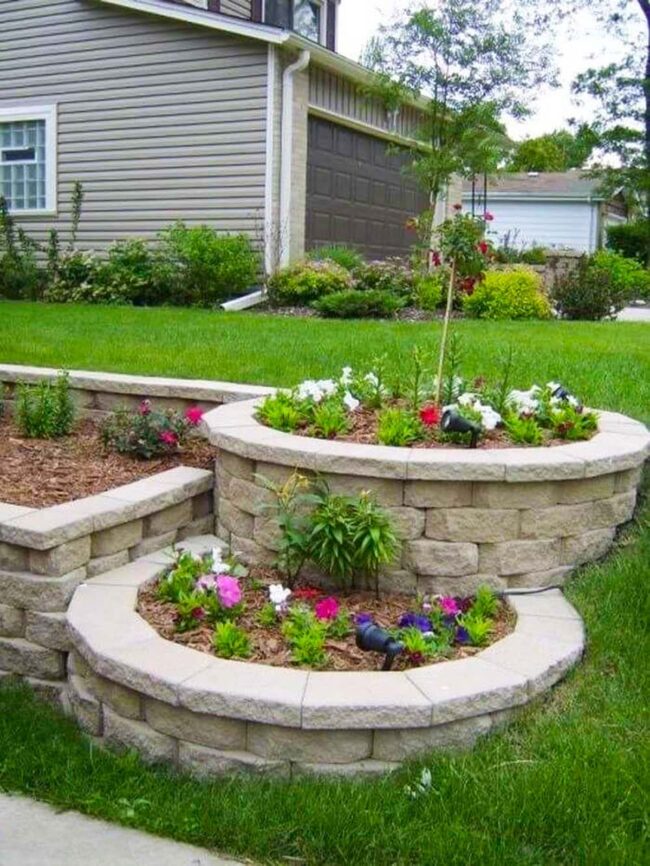 Stone planters strategically arranged in a circular design create a stunning suburban garden landscape that maximizes visual interest and plant diversity.