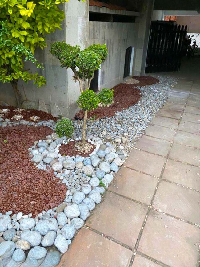 Smooth river stones strategically placed around these living sculptures add textural depth and clean visual boundaries to the landscape.