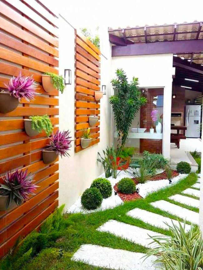 Garden designers love wooden slat walls that create a striking backdrop for terracotta pots bursting with colorful plants and greenery.