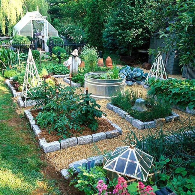 French-inspired design elements elevate these spaces beyond traditional vegetable plots, incorporating artistic elements like vintage bathtubs and ornate iron bed frames.