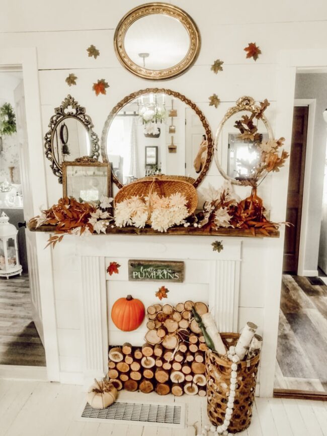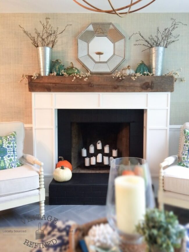 Seasonal decorations perch delicately on the slim wooden plank mantel, adding personal touches that spark warmth and interest.