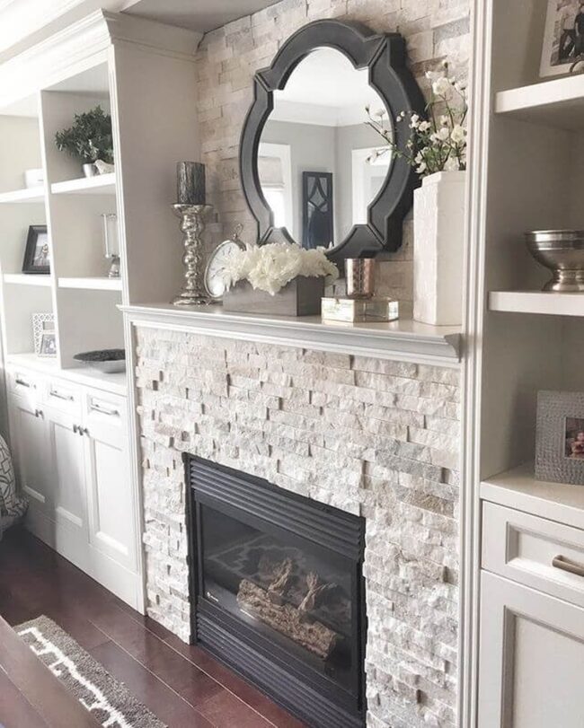 White paneling with marble surround creates an elegant living room centerpiece that instantly elevates home design.