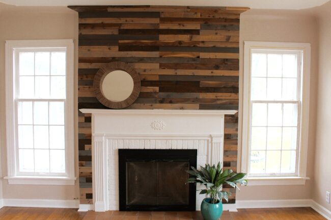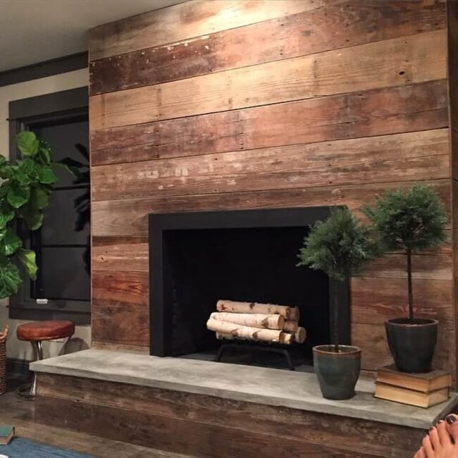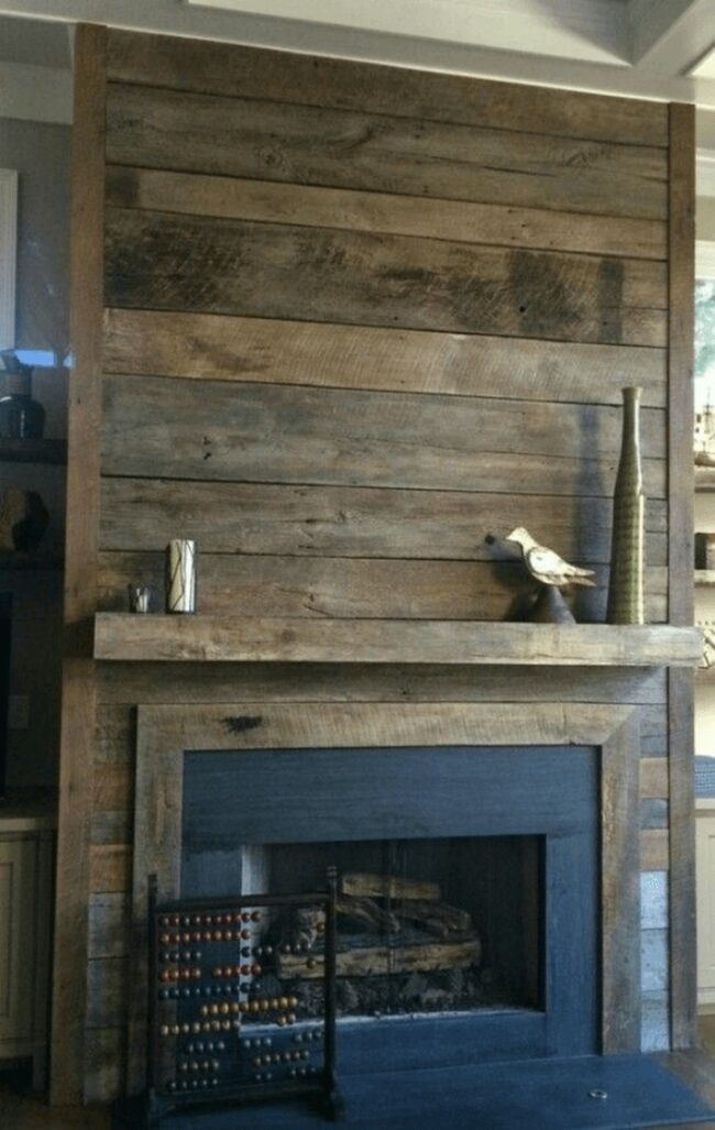Rustic brown boards create a magical fireplace alternative that instantly warms any living space without traditional flame requirements.