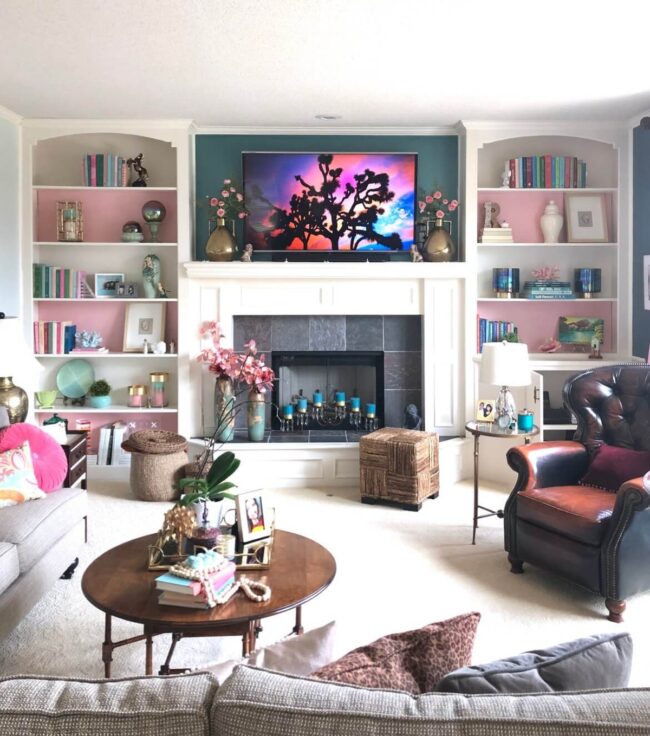 Game nights become magical in this inviting space that centers around a chic fireplace flanked by matching bookcases.