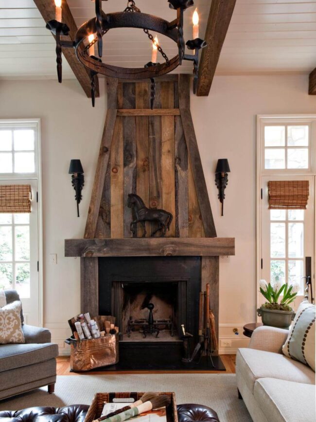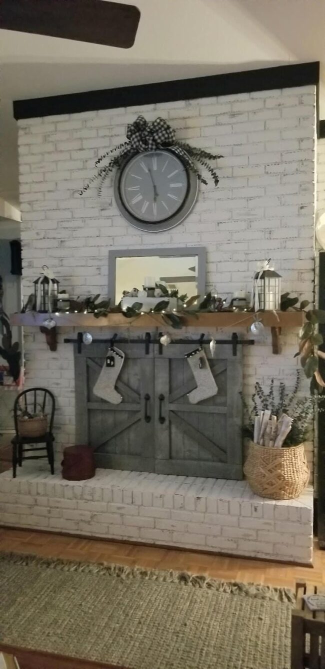 Miniature barn doors bring exceptional style to the fireplace, making the space feel intentionally designed.