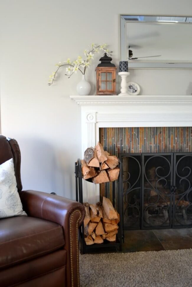 Log ends nestled inside provide a clean, artistic accent without wood-burning hassles.