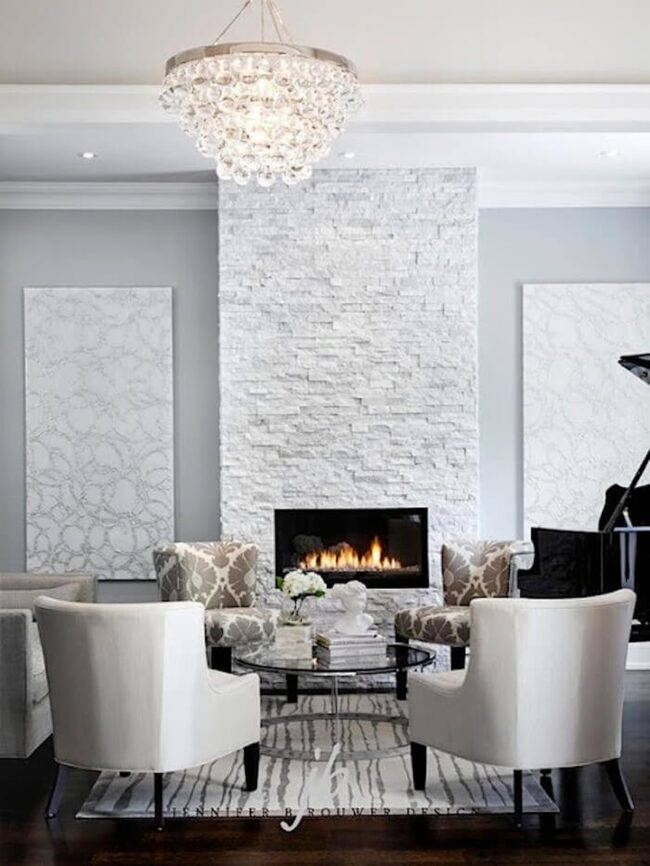 Stunning marble adds luxurious texture and depth to classic white walls, making the space feel sophisticated and refined.