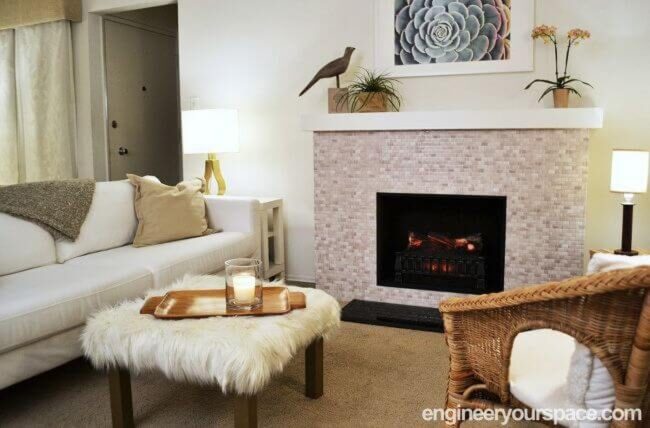 Small ceramic tiles add texture and visual interest to the room's focal point.
