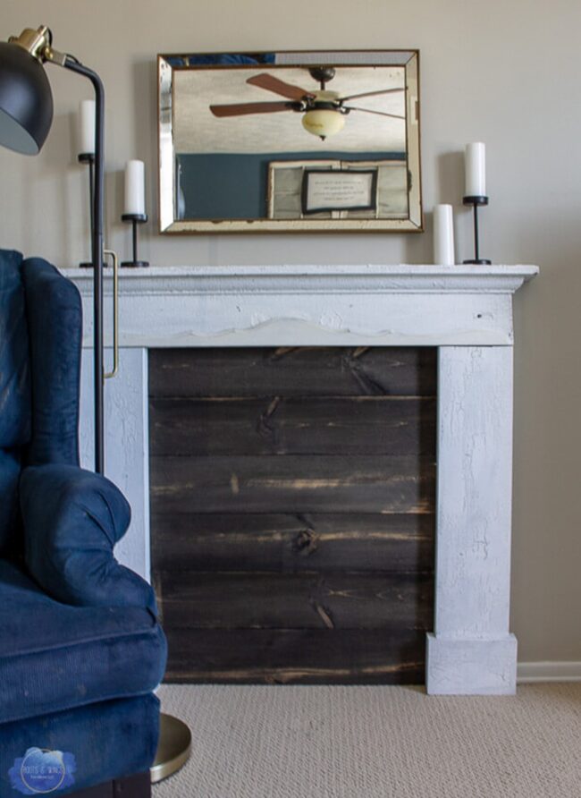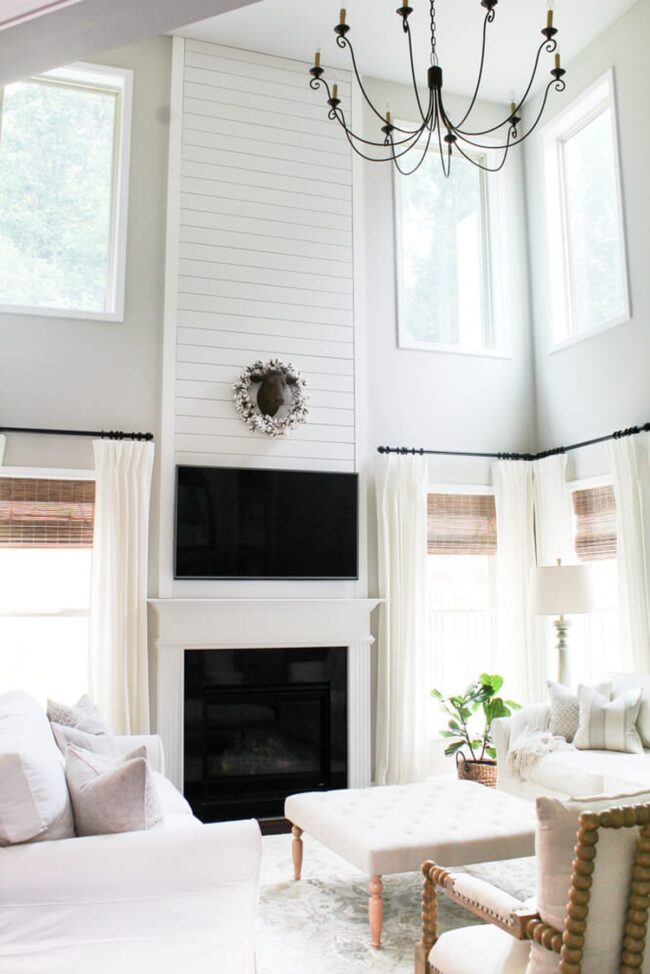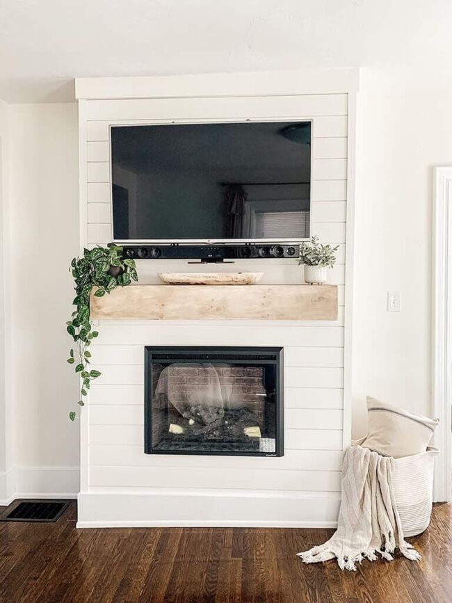 Shiplap extends beyond the fireplace, creating visual continuity and depth in the living space.