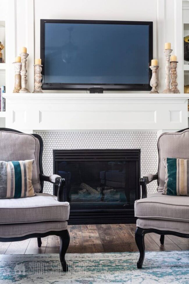 White hexagon tiles create a sleek, modern fireplace upgrade that catches everyone's eye.