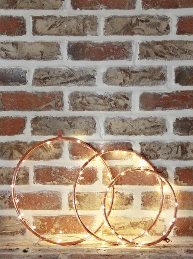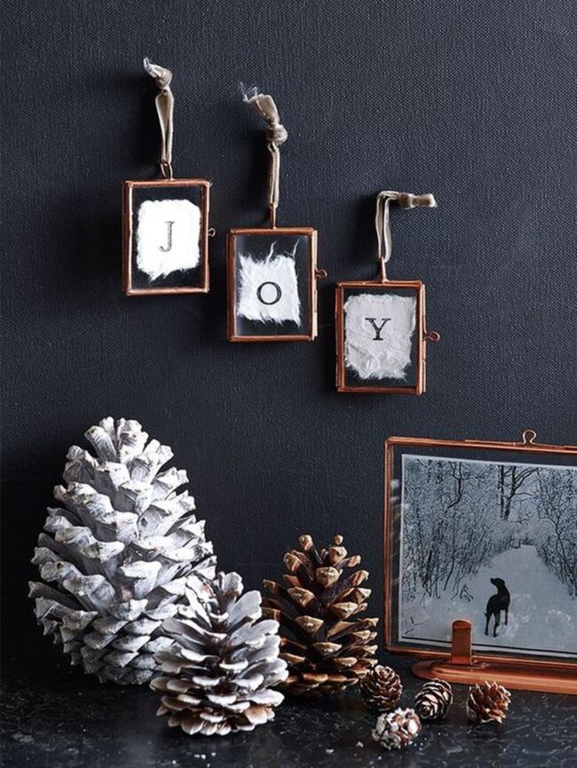 Holiday decor doesn't need complexity to shine - metal triangular frames sporting copper and white ornaments can instantly elevate your living space with understated charm.