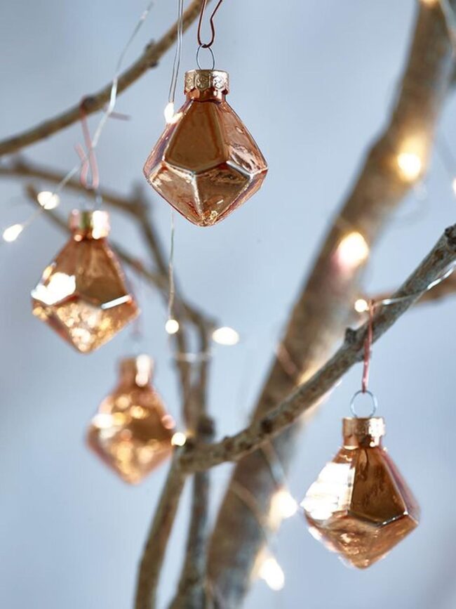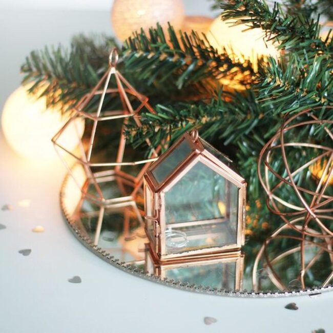 Copper geometric decor sparkles against lush pine branches, creating a mesmerizing display that instantly catches your eye and draws you into its enchanting world.