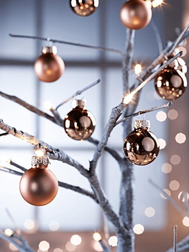 Golden ornaments dancing on a slender branch whisper stories of quiet celebration and intimate charm.