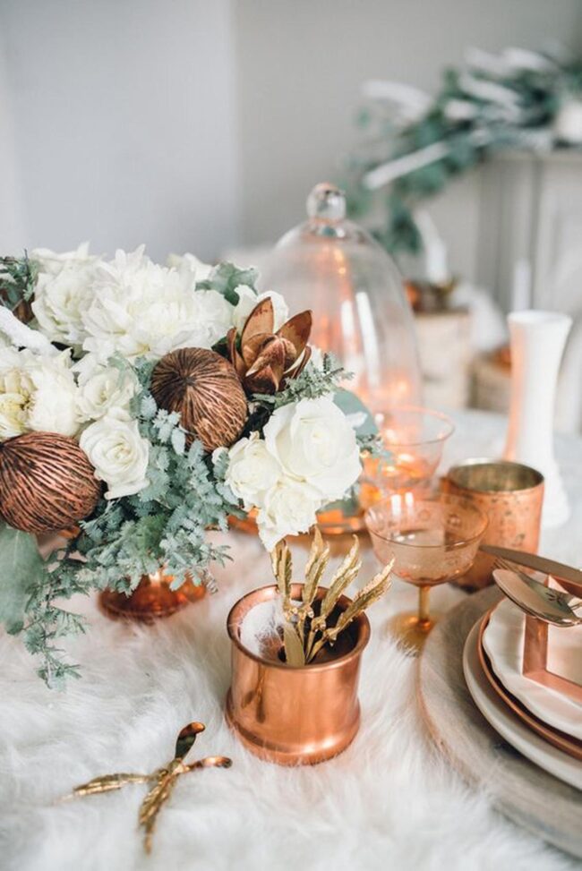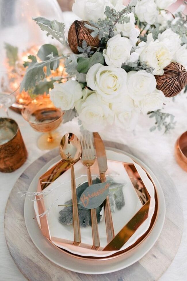 Unlike traditional gold or silver, copper adds a distinctive, rosy undertone that harmonizes beautifully with greenery, wood, and velvet textures.