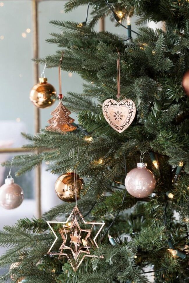Tiny metal hearts and stars nestle playfully among the greenery, tweaking an ordinary tree into a festive masterpiece that feels both personal and enchanting.
