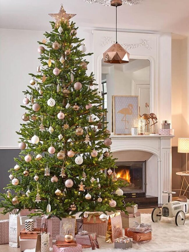 Your holiday decor can spark pure enchantment with carefully chosen rose gold ornaments dancing among deep green pine branches.