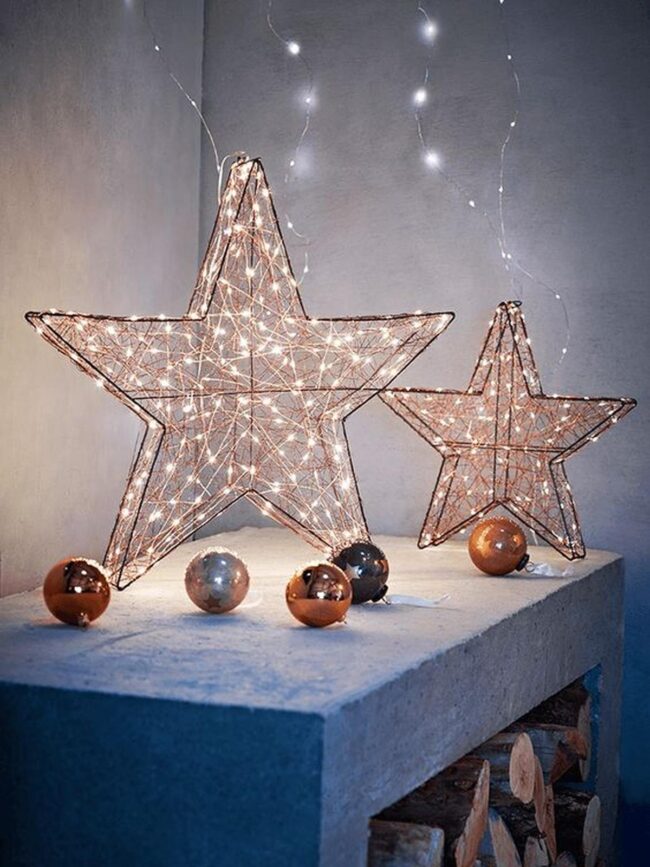 Sparkling silver and copper ornaments dance around delicate wire stars, casting enchanting light across a stone backdrop that whispers winter magic.