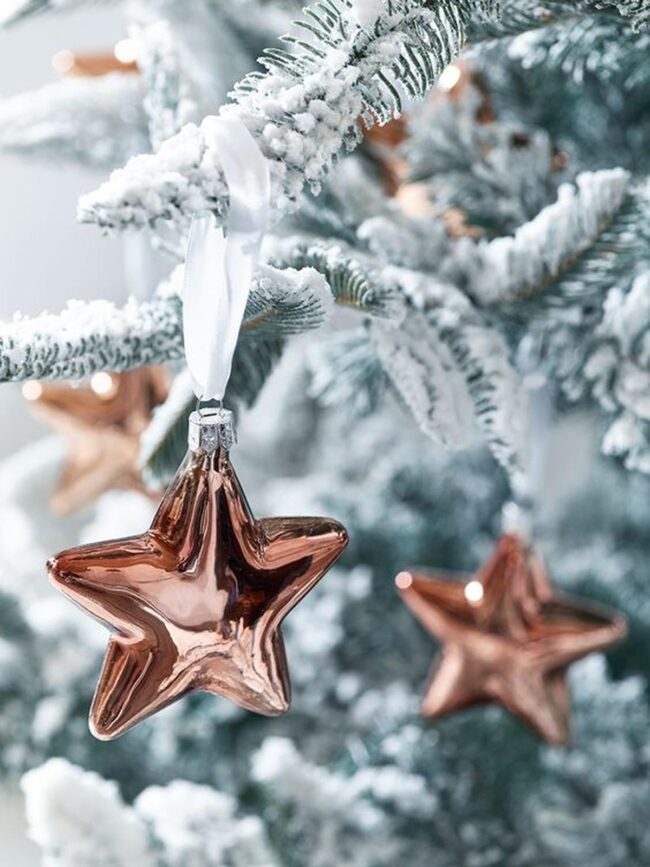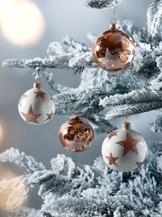 Glittery star-patterned white ornaments and gleaming copper spheres dance together, catching and reflecting light with delightful whispers of seasonal joy.