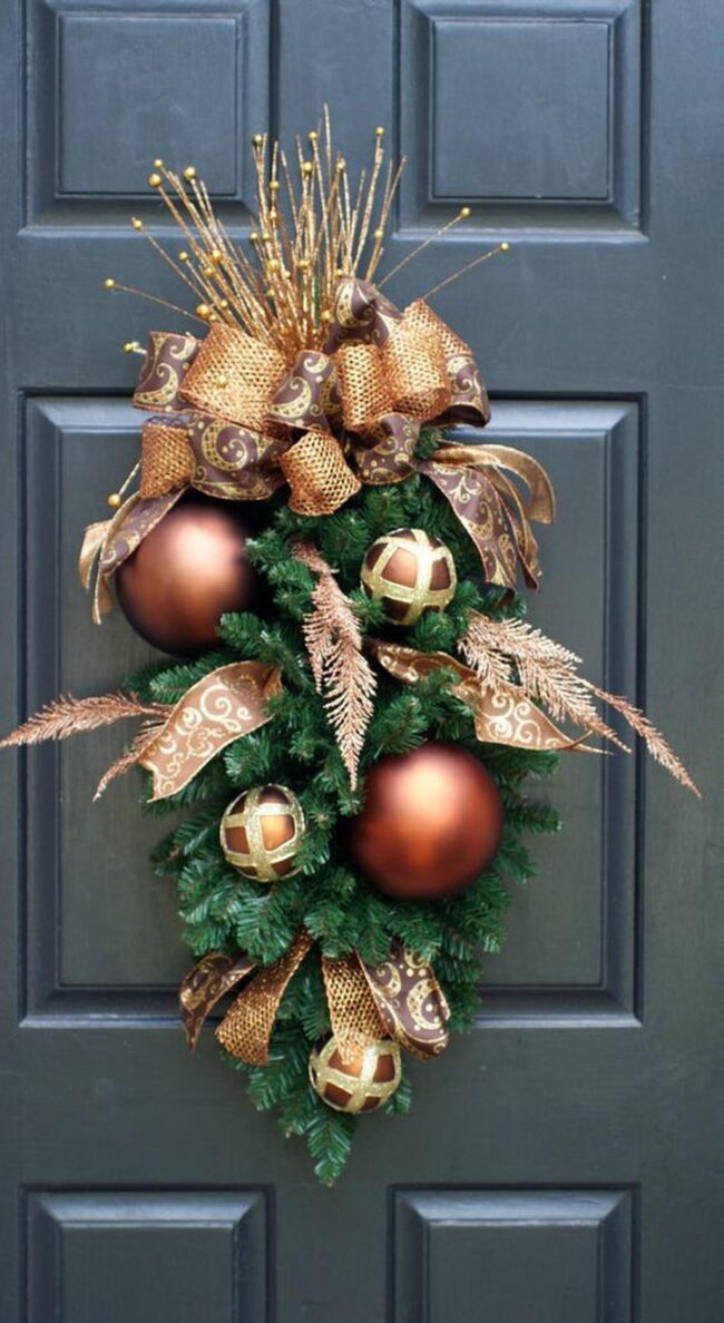 Your front door becomes a stunning canvas where a golden wreath meets deep black backdrop, instantly drawing eyes with shimmering metallic leaves.