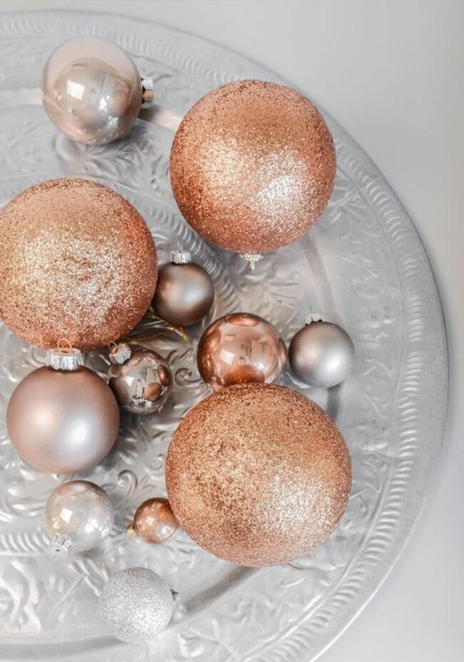 Holiday ornaments sparkle and shine on a stunning silver plate, creating a mesmerizing display that instantly draws your eye with its mix of sizes and textures.