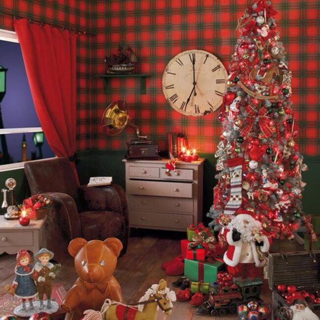 Rich red plaid walls embrace a stunning Christmas tree decorated with pristine white and crimson ornaments, creating a stunning focal point that sparks joy.
