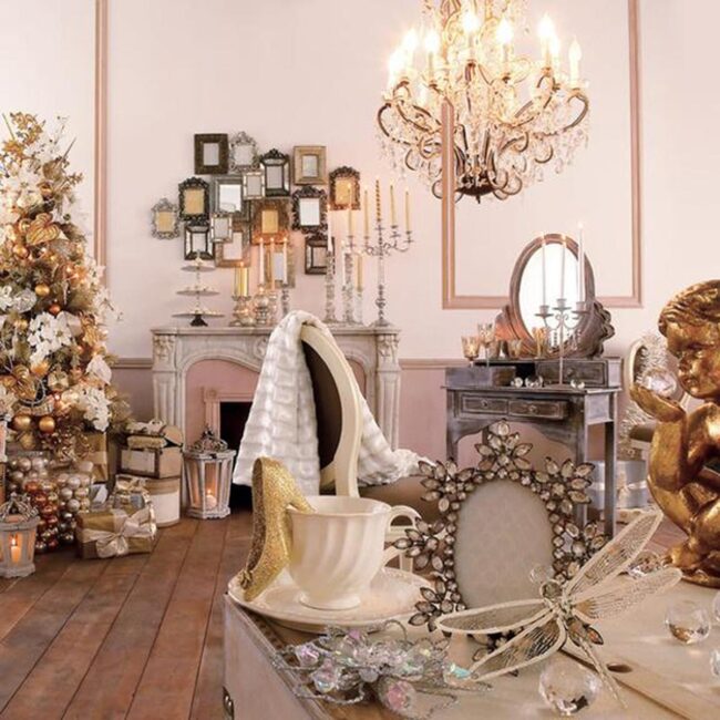 Crystal accents and golden statues scatter magic throughout the room, inviting warmth and celebration into every corner.