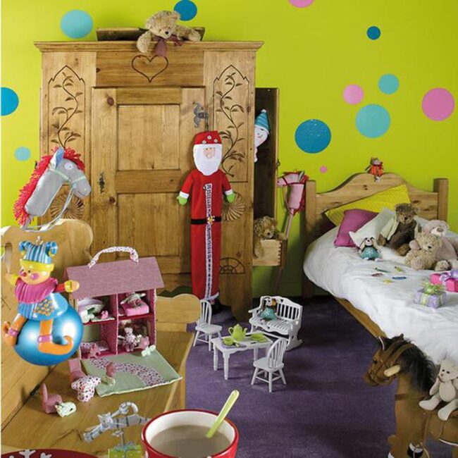 Kids find magic in a bedroom where emerald walls burst with cheerful colored circles and wooden beds invite cuddly teddy bear companionship.