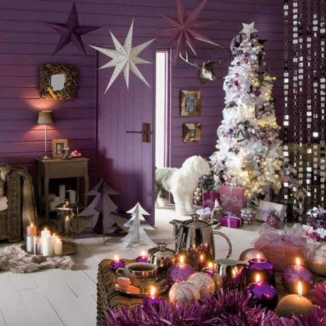 Soft candlelight dances through a room draped in deep purple walls, weaving magic and comfort into every corner.