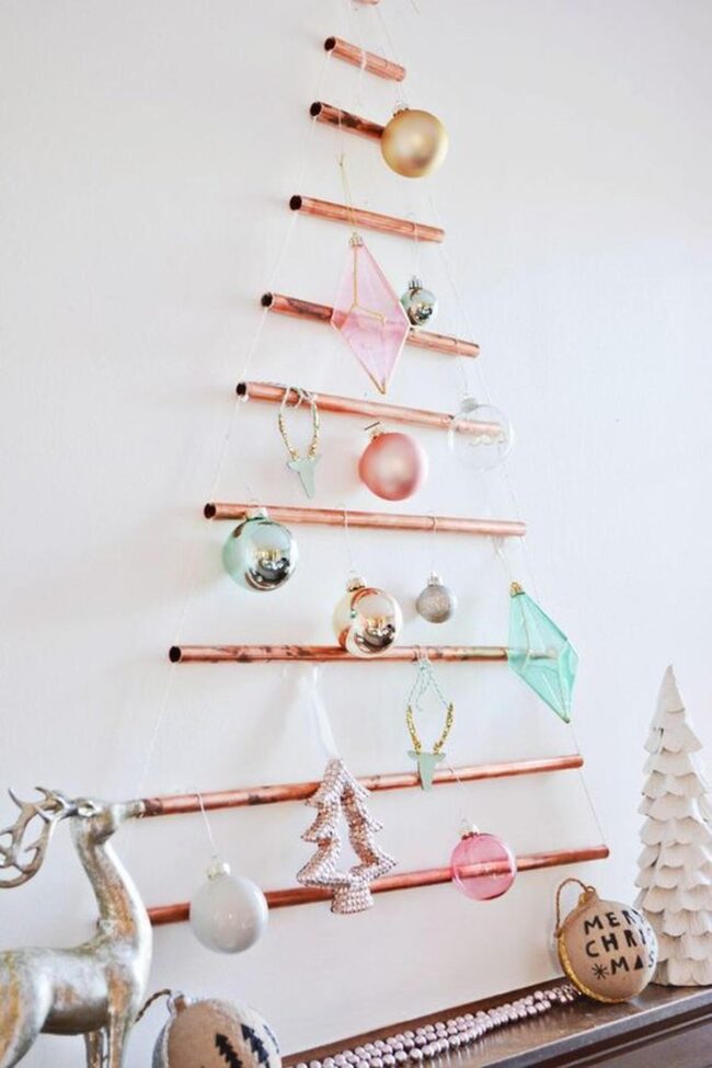 Copper rods polish your wall into an eye-catching holiday masterpiece with their geometric triangular frames that dance with colorful glass ornaments.