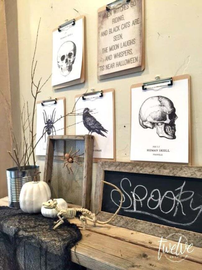 Scattered skull accents provide sharp visual interest across shelves and surfaces, creating an instantly haunting environment.