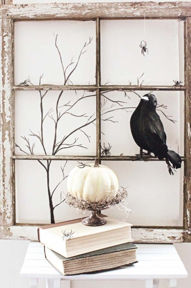 Strategic spider decorations placed against white shutters introduce subtle Gothic elegance without overwhelming the scene.