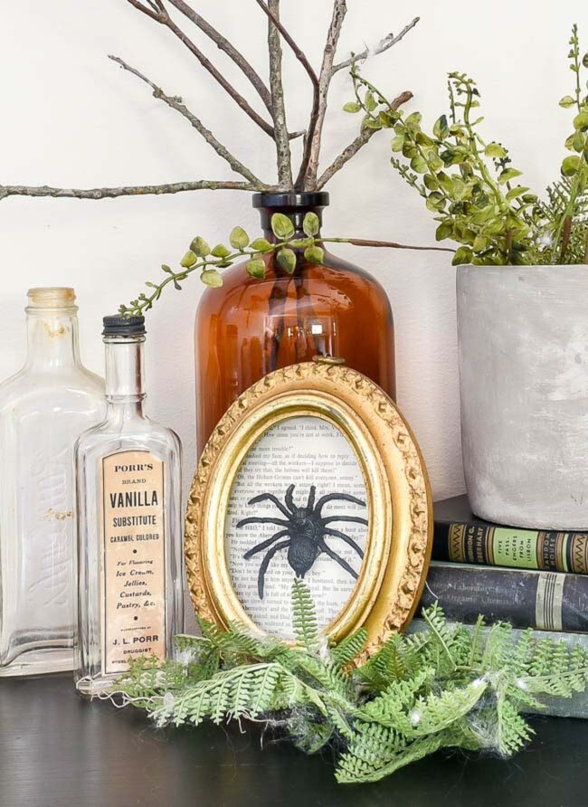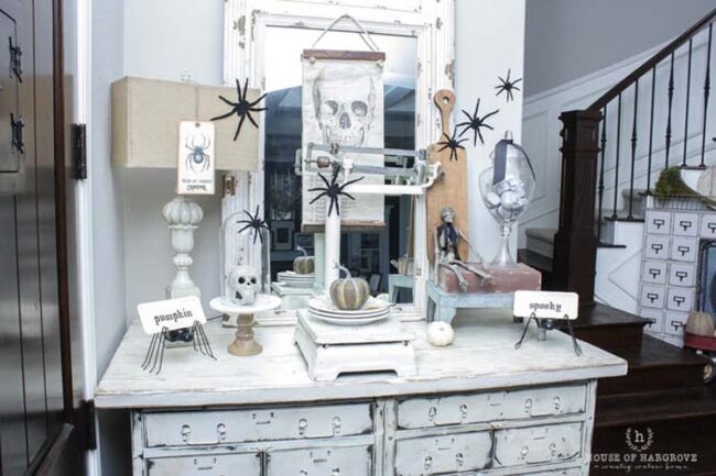 Small decorative pumpkins and playful ceramic spiders add whimsical texture and visual interest to the display.