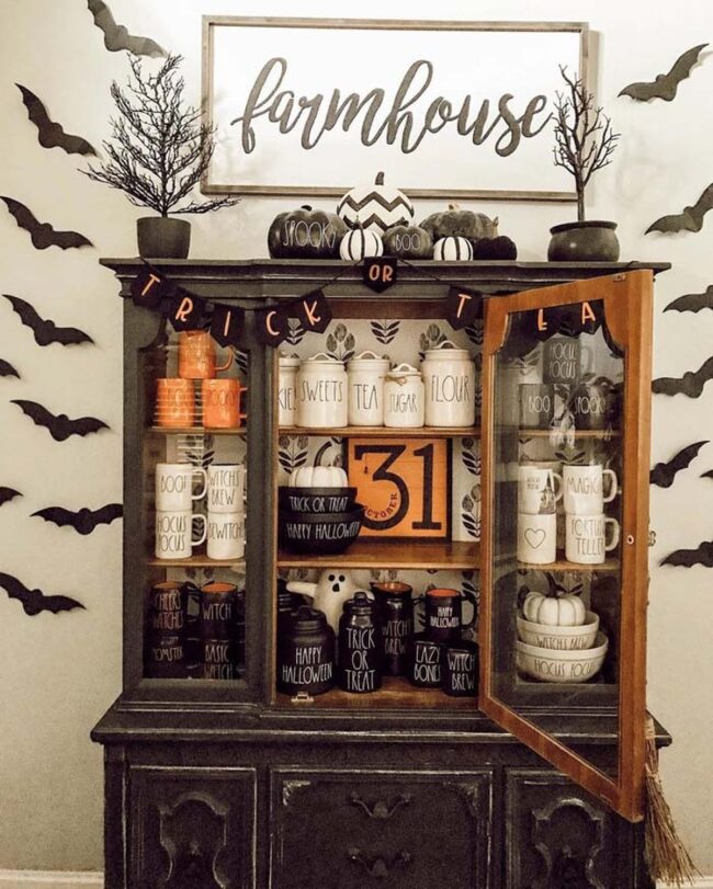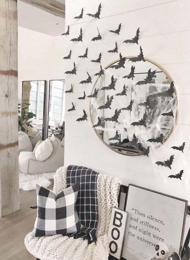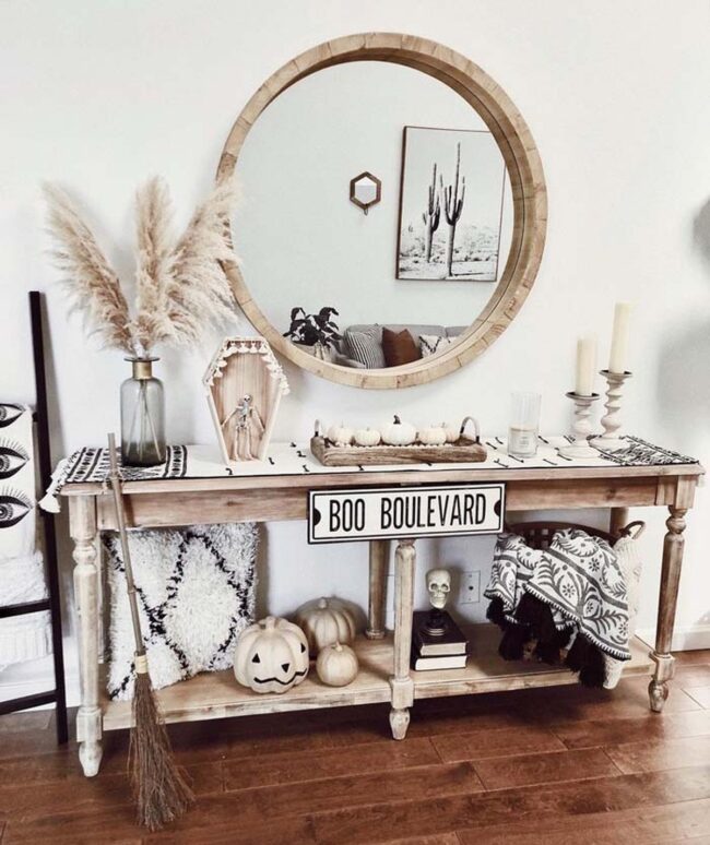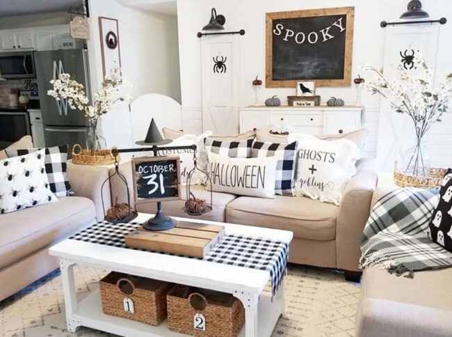 Neutral color palettes of whites, grays, and muted blacks enhance the farmhouse style while maintaining a sophisticated Halloween mood.