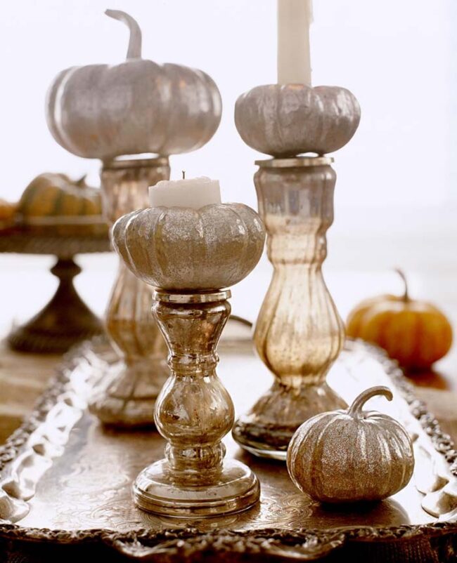 Small decorative pumpkins and faux autumn leaves nestle perfectly within the metallic surfaces, bringing warmth and texture to your space.