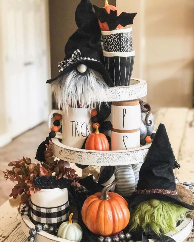 Charming black and white gnomes intermingle with petite orange pumpkins, creating a festive display that instantly elevates kitchen decor.