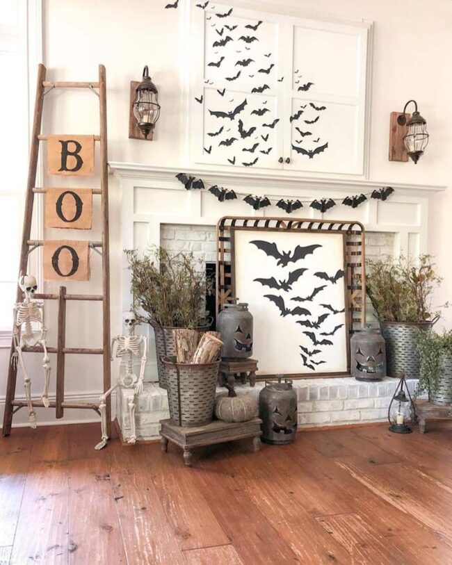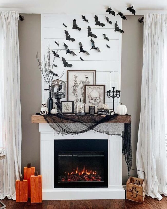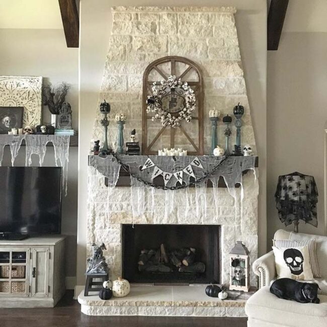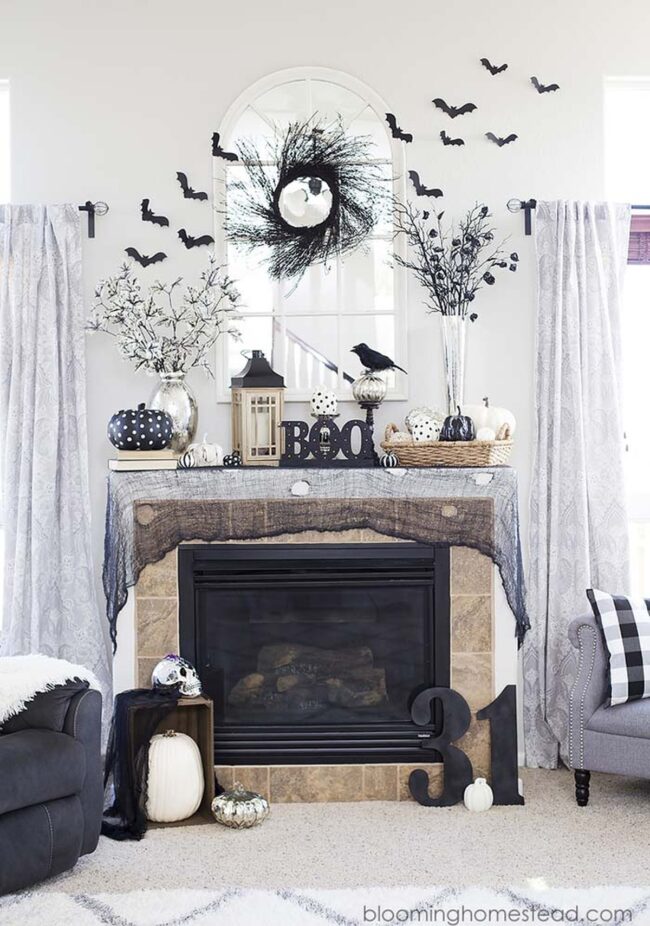 Rustic Halloween mantel decor embraces elegance through a monochromatic black and white palette that elevates seasonal styling beyond typical orange themes.