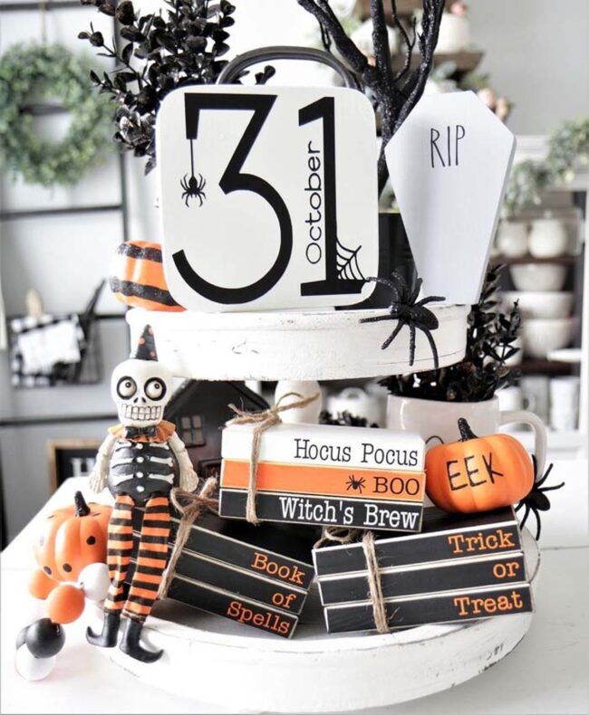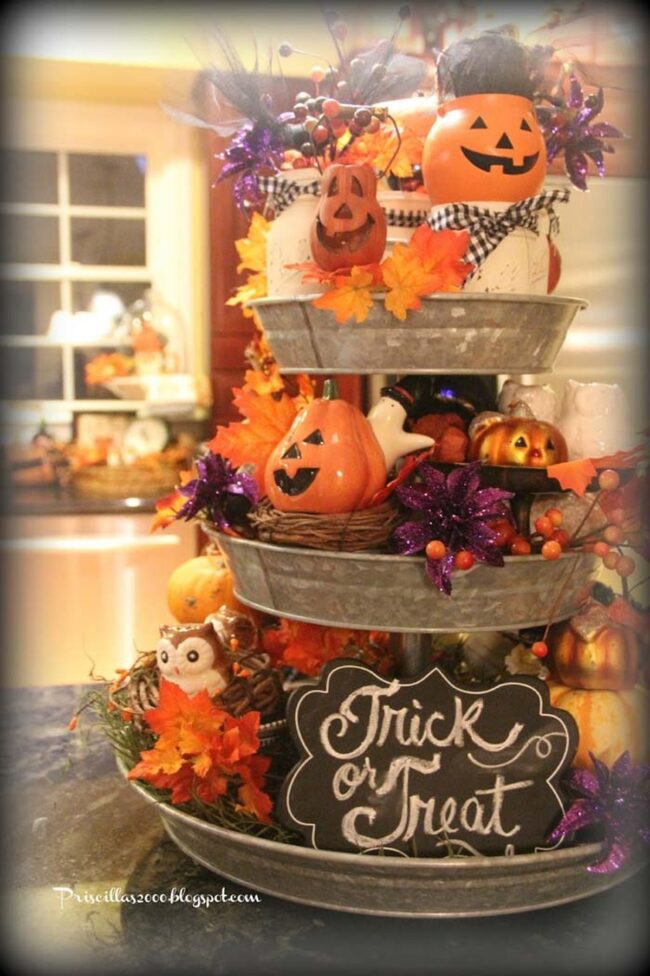 Galvanized metal trays elevate Halloween decor with rustic farmhouse appeal, creating an instant focal point for seasonal displays.