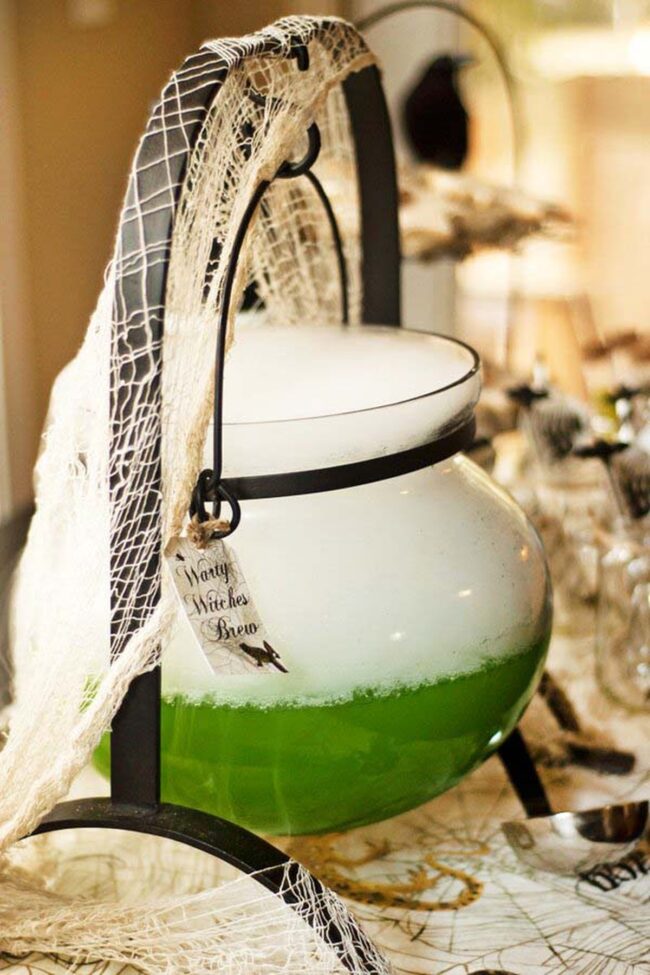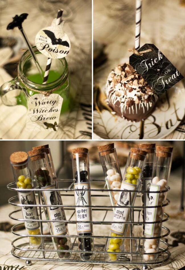 Glass flasks with handcrafted tags suggesting sinister contents like "Witch's Brew" or "Vampire's Kiss" elevate the aesthetic from simple drink station to interactive Halloween experience.