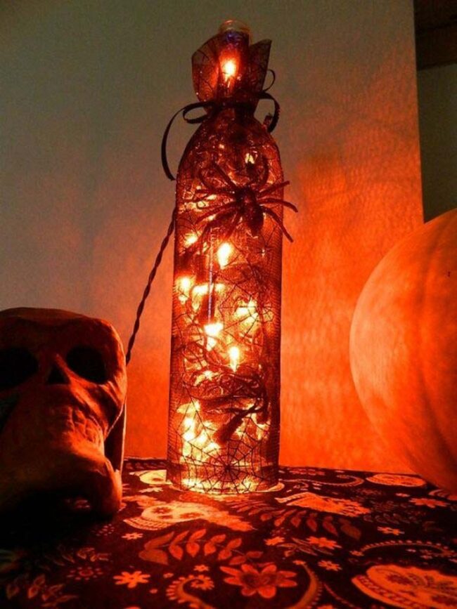 Spooky Halloween decor reaches new heights with a mesmerizing spiderweb wine bottle light that casts eerie shadows across room walls.