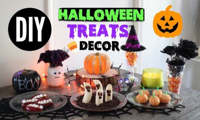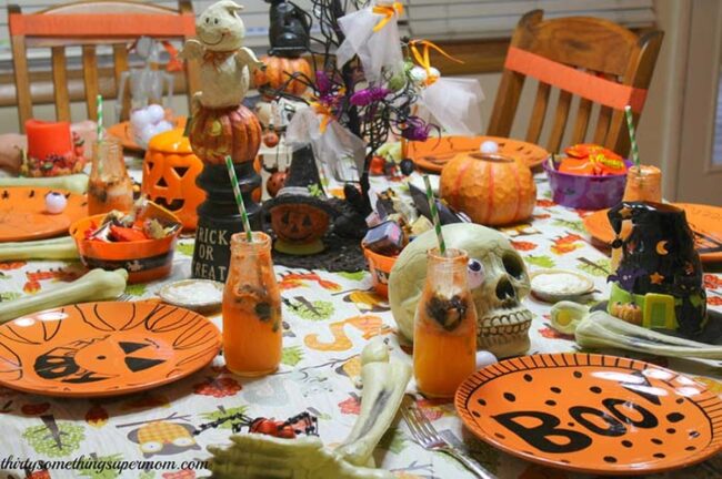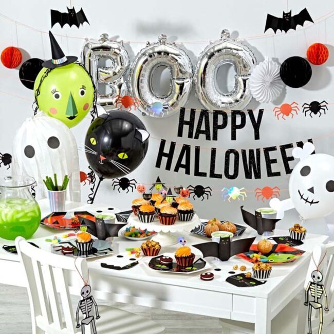 Playful paper banners dance across the table, inviting children to explore the delectable Halloween spread with wide-eyed wonder.